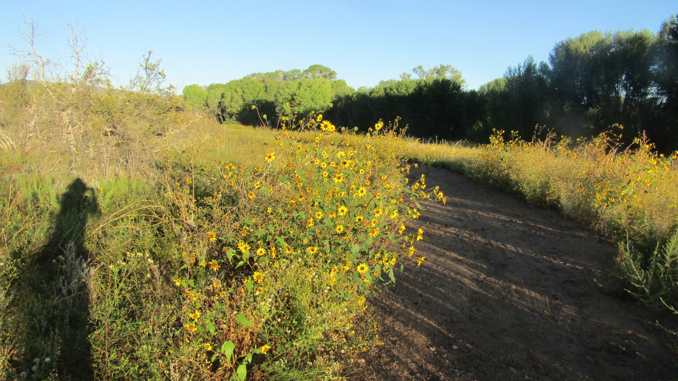 West Willow is a 1.1-mile loop trail along the Willow Lake shore. It is hooded by huge cottonwood trees supplying plenty of shade, and downed trees and limbs offer a few places to sit and just enjoy nature. The trail is dotted with yellow flowers and the dry wash on the way to the trail has brilliant red and purple blossoms.