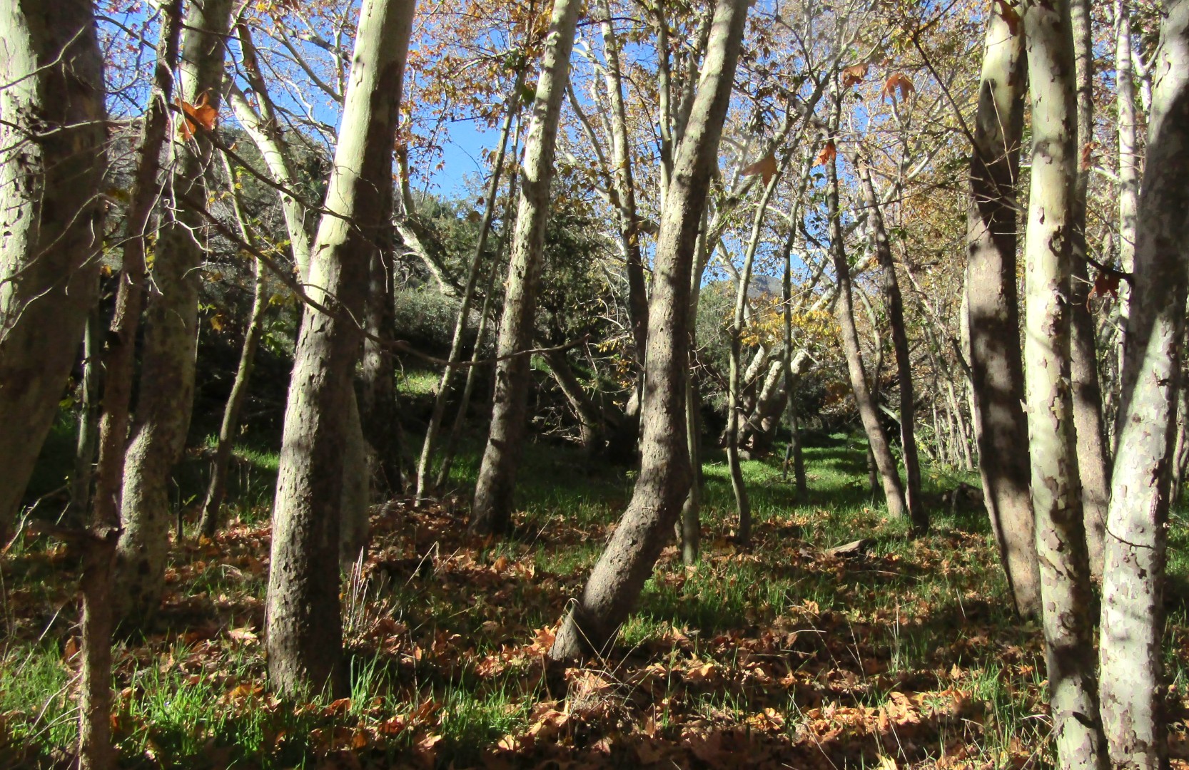 From the parking area near the community of Sunflower — if you blink, you’ll miss it — you go a quarter-mile down a dirt road to a sign across from a wash, just before a cattle guard. That’s where you’ll catch your first closeup of the sycamores and cottonwoods. You yearn to see more of the colors in the trees, and the hike to Bushnell Tanks does not let you down.
