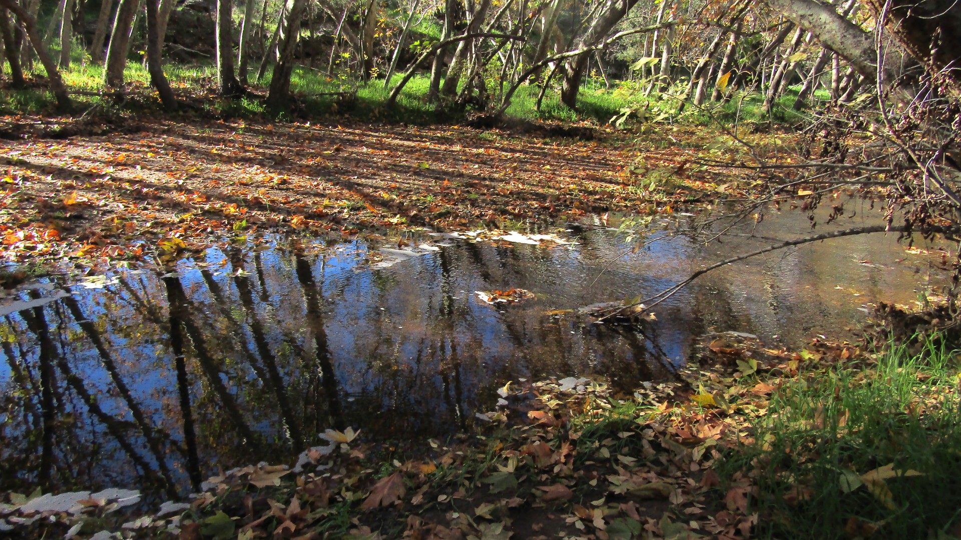 It was cool when we set out, but mist was rising from Sycamore Creek before it warmed up. Most of the leaves were still on the trees, but many had fallen to dance in the creek, showing off their wonderful contrast with the flowing stream.